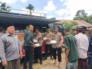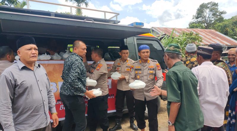 Redelong- Kapolres Bener Meriah didampingi Wakapolres dan personel membagikan makanan kepada jamaah solat Jumat yang berlokasi di Masjid Baburahmah Kampung Jamur Atu, Kecamatan Mesidah, Kabupaten Bener Meriah, Jumat 2 Juni 2023.