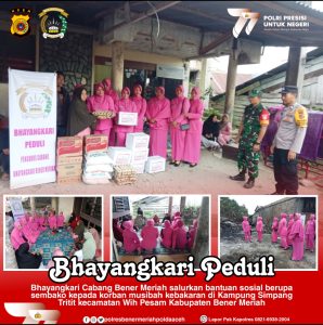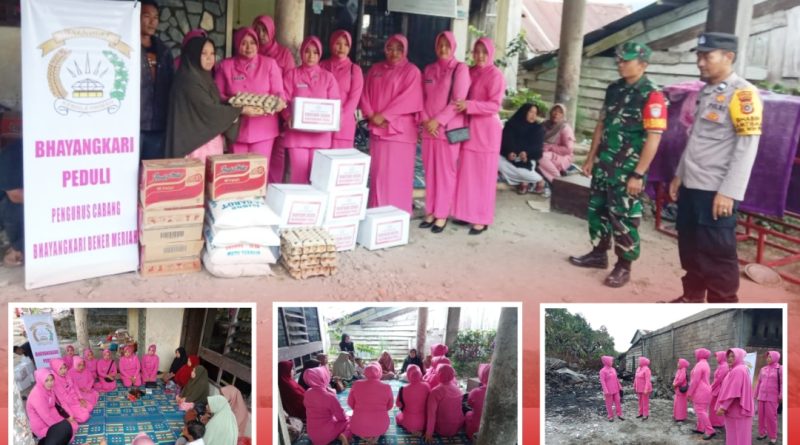 Redelong- Ketua Bhayangkari Cabang Bener Meriah Ny. Rika Nanang yang di wakili oleh Wakil ketua Bhayangkari Cabang Bener Meriah Ny. Titi Fauzi beserta pengurus Bhayangkari Cabang Bener Meriah menyalurkan bantuan sosial kepada korban bencana kebakaran di Simpang Tritit, kecamatan Wih Pesam, Kabupaten Bener Meriah. Sabtu (17/06/2023).