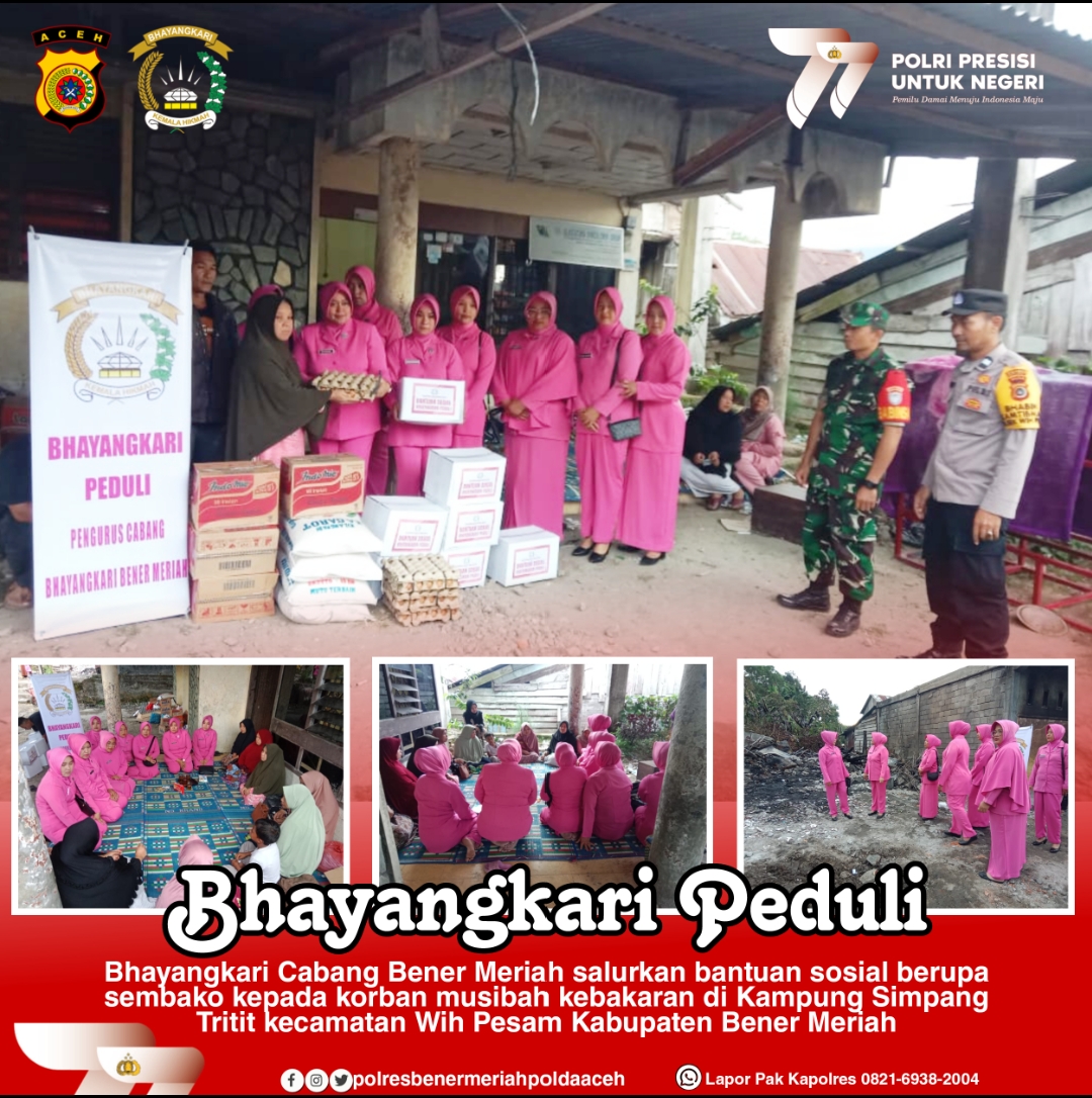 Wakil ketua Bhayangkari Cabang Bener Meriah Ny. Titi Fauzi mengatakan, Bantuan sosial merupakan wujud Kepedulian Bhayangkari untuk masyarakat, dan membantu warga yang sedang tertimpa musibah, semoga apa yang diberikan bisa membantu meringankan beban masyarakat sekaligus memotivasi untuk tetap semangat dalam menjalankan aktifitas sehari-hari.