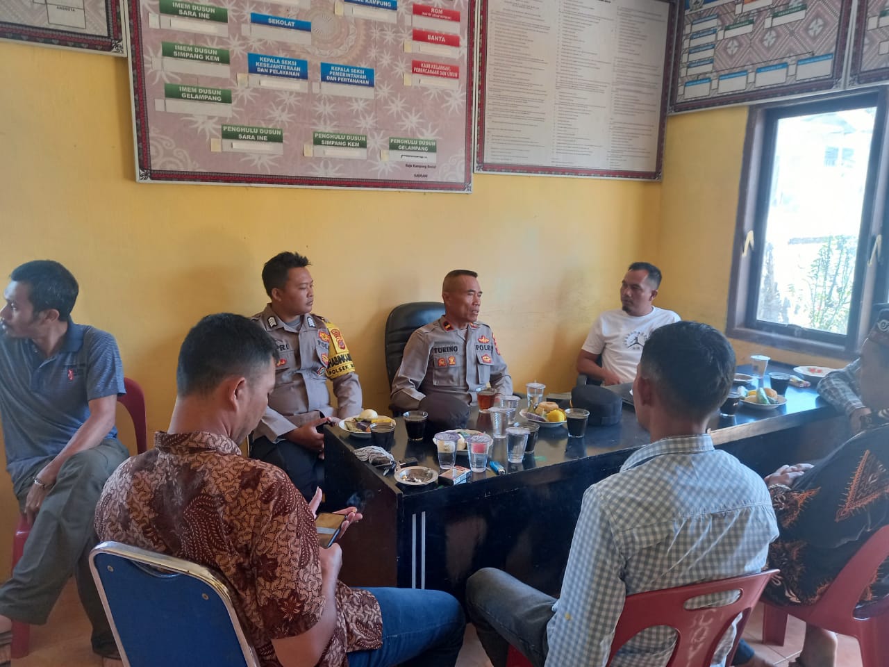 Kapolsek Mesidah Ipda Turino melaksanakan kegiatan Jum’at Curhat dalam program Quwic Wins Presisi bersama Reje Kampung Sosial beserta aparatur kampung Sosial Kecamtan Mesidah Kabupaten Bener Meriah, Jumat (23/6/2023)