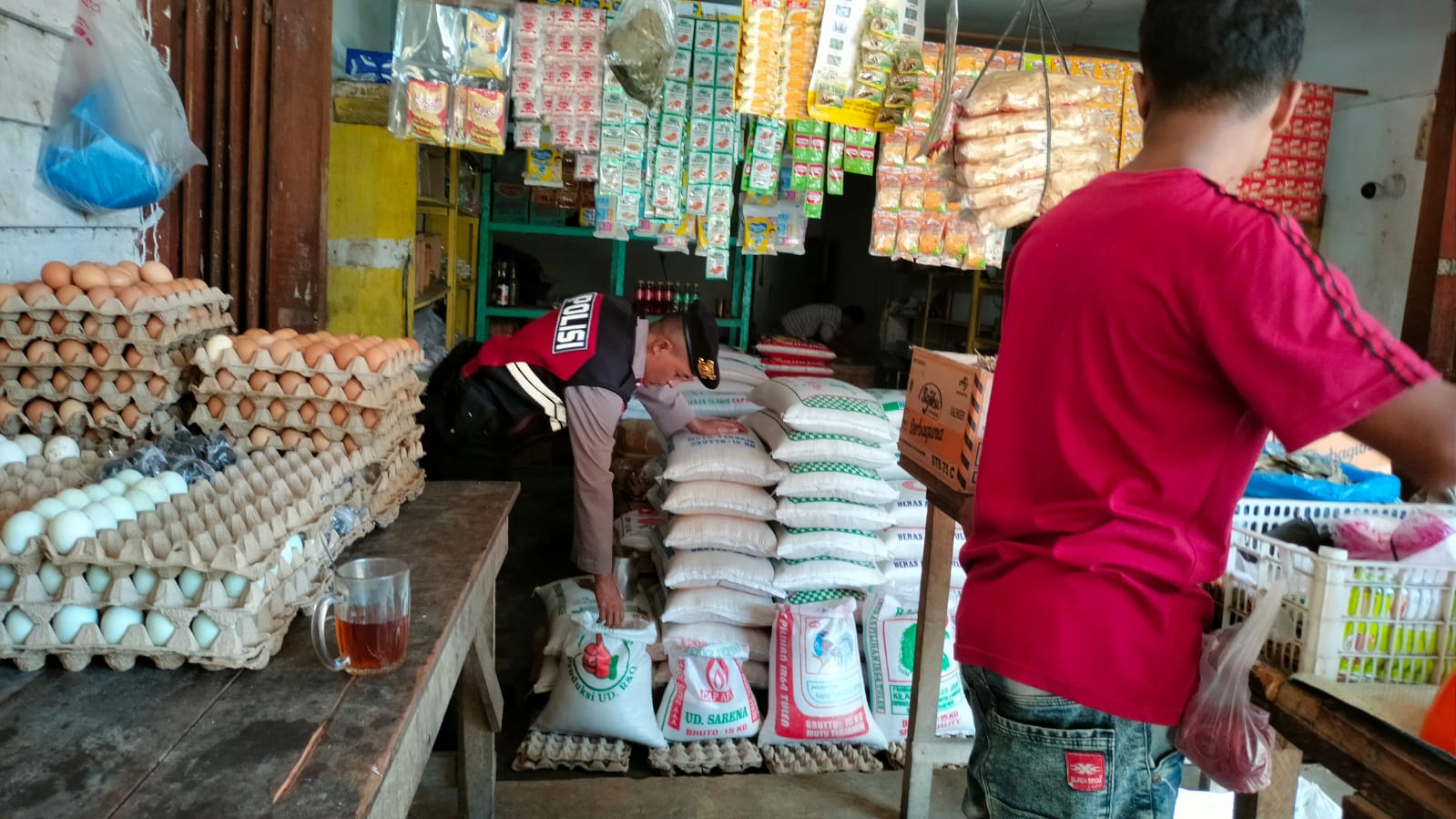 Redelong- Personil Piket Polsek Pintu Rime Gayo melaksanakan Giat pengecekan dan pemantauan ketersediaan sembako di kios-kios pedagang yang ada di Kampung Blang Rakal, Kecamatan Pintu Rime Gayo, Kabupaten Bener Meriah, Senin (26/6/2023)