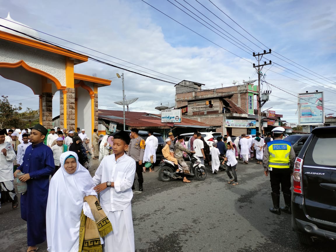 Redelong- Untuk menciptakan suasana khusyuk pada saat pelaksanaan shalat Idul Adha 1444 Hijriah, Personel Polsek Wih Pesam dan personel satuan Lalulintas Polres Bener Meriah melakukan pengamanan dan pengaturan pada saat shalat Idul Adha di masjid Al-Amilin Kampung Pante Raya Kecamatan Wih Pesam Kabupaten Bener Meriah, Kamis 29 Juni 2023.