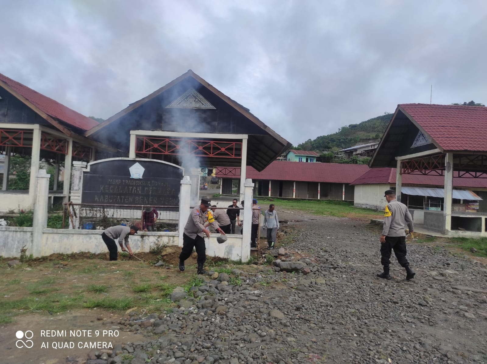 Personil Polsek Permata dan Masyarakat melaksanakan kegiatan bakti sosial Polisi peduli lingkungan secara serentak membersihkan lingkungan bersama masyarakat di Pasar Buntul Kemumu Kampung Gelampang Wih Tenang Uken Kecamatan Permata Kabupaten Bener Meriah, Kamis (13/7/2023)