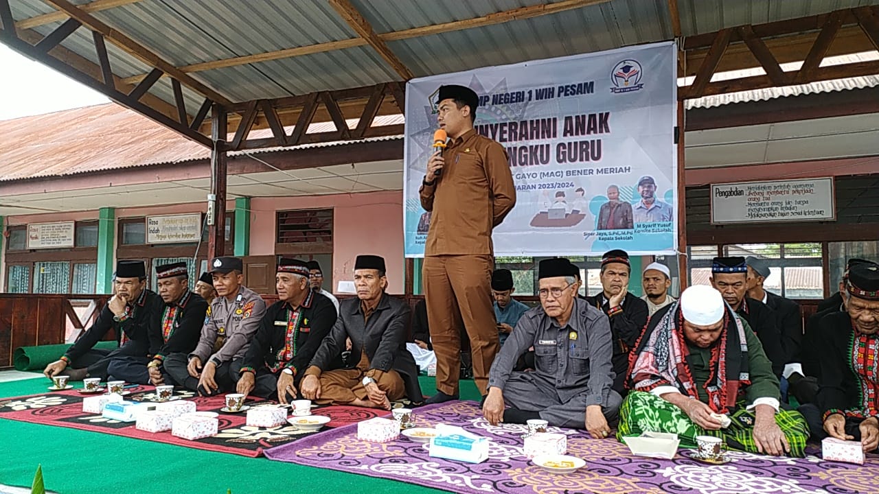 Redelong – Kapolsek Permata Ipda Saifuddin. M hadiri kegiatan penyerahan murid kepada guru yang dilaksanakan di Sekolah Belangi SMPN 1 Wih Pesam, Kecamatan Wih Pesam, Kabupaten Bener Meriah oleh Majelis Adat Gayo (MAD), Selasa (1/8/2023)
