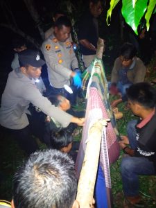 Redelong- Personel kepolisian Sektor Bandar di bantu petugas medis dan masyarakat setempat mengevakuasi mayat seorang pria yang terangkut di batang pohon alpukat, di dalam perkebunan kopi di kampung Petukel Blang Jorong, Kecamatan Bandar Kabupaten Bener Meriah, Jum’at 4 Agustus 2023.