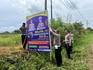 Redelong – Satuan Lalu Lintas Polres Bener Meriah melakukan pemasangan spanduk himbauan kepada pengguna jalan dan Miniatur mobil Patroli Lalu Lintas di beberapa titik Rawan kecelakaan di Wilayah Bener Meriah, Rabu (23/8/2023)