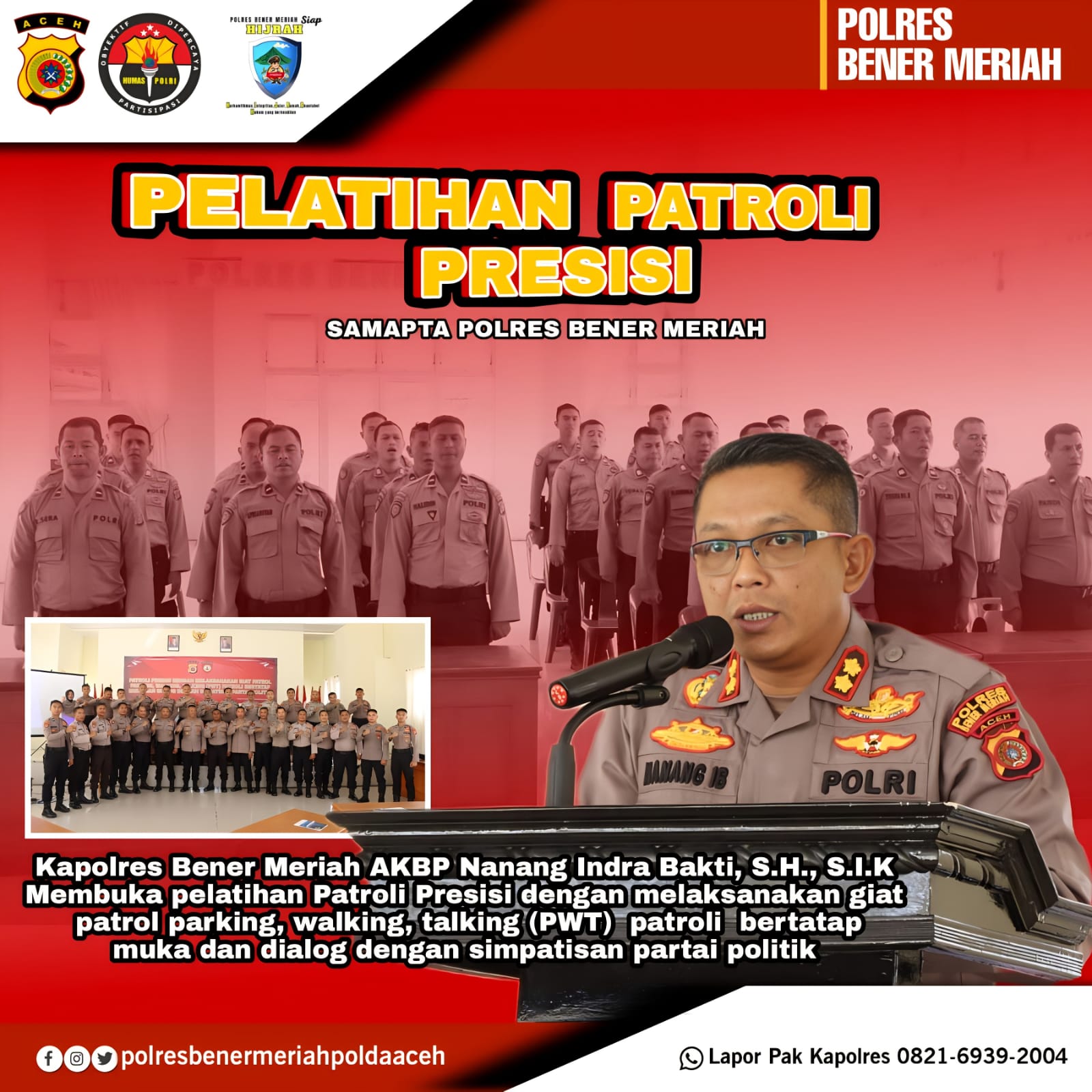 Redelong – Kapolres Bener Meriah AKBP Nanang Indra Bakti, SH, SIK buka pelatihan Sat Samapta di aula Endra Dharma Laksana Polres Bener Meriah, Selasa (29/8/2023)