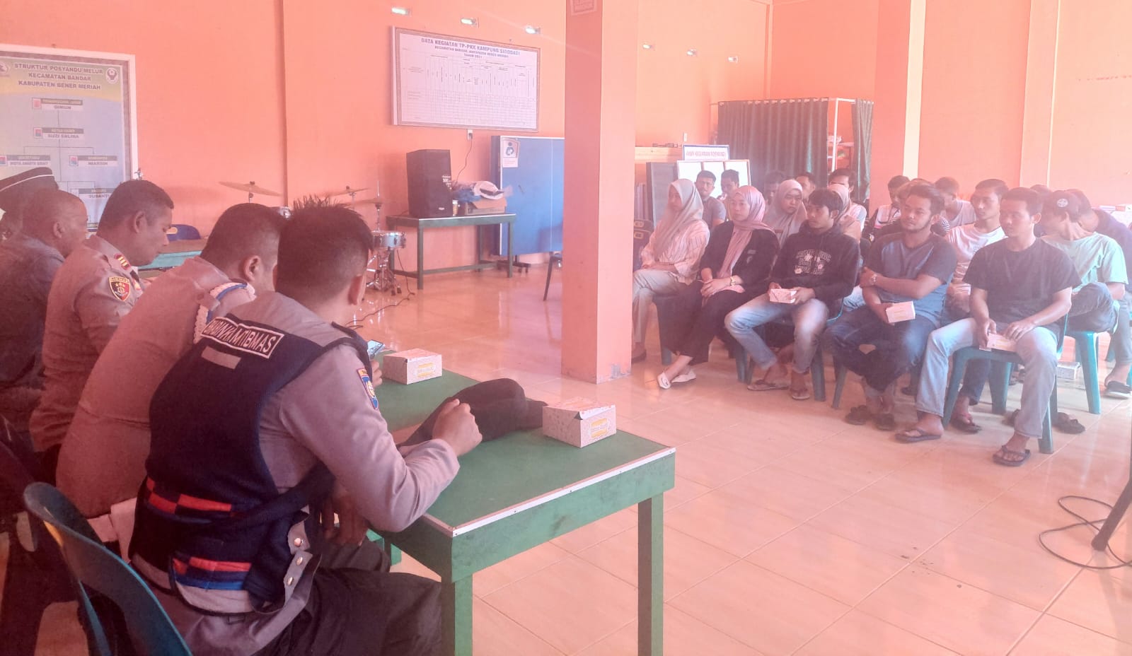 Redelong – Personil Polsek Bandar melaksanakan kegiatan sosialisasi tentang bahaya penyalahgunaan Narkoba dalam rangka peningkatan kapasitas Karang Taruna Kampung Sidodadi yang diselenggarakan oleh Polsek Bandar Polres Bener Meriah, yang bertempat di Gedung Serba Guna Kampung Sidodadi, Kecamatan Bandar, Kabupaten Bener Meriah, Rabu (30/8/2023)