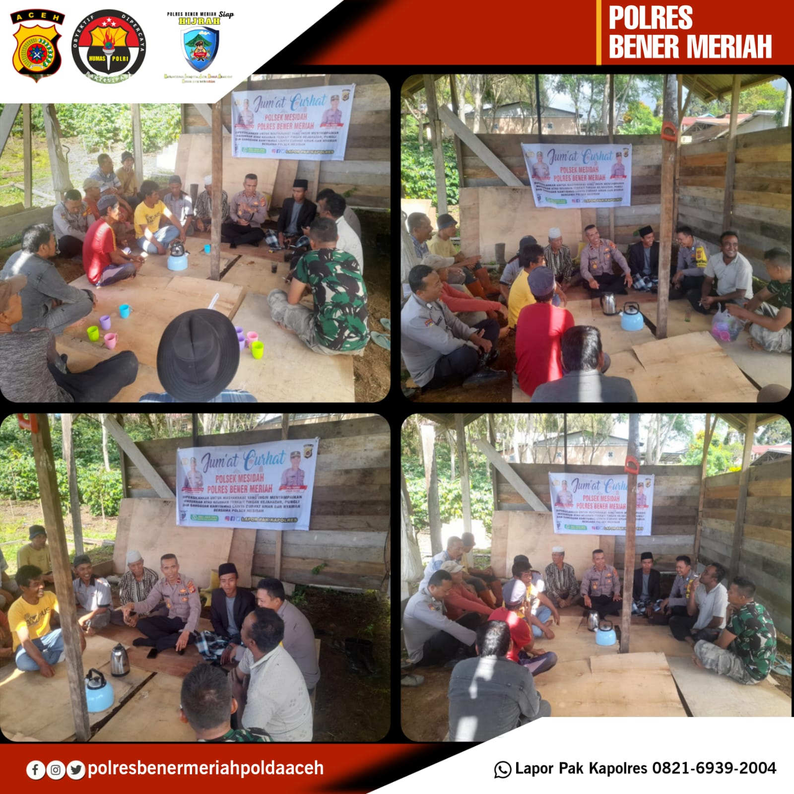 Jum’at Curhat ini merupakan salah satu program gagasan Kapolda Aceh yang dilaksanakan oleh seluruh Polres jajaran Polda Aceh khususnya Polres Bener Meriah. Hal ini bertujuan agar masyarakat dapat menyampaikan secara langsung tentang pendapat, keluhan dan saran kepada Polri.
