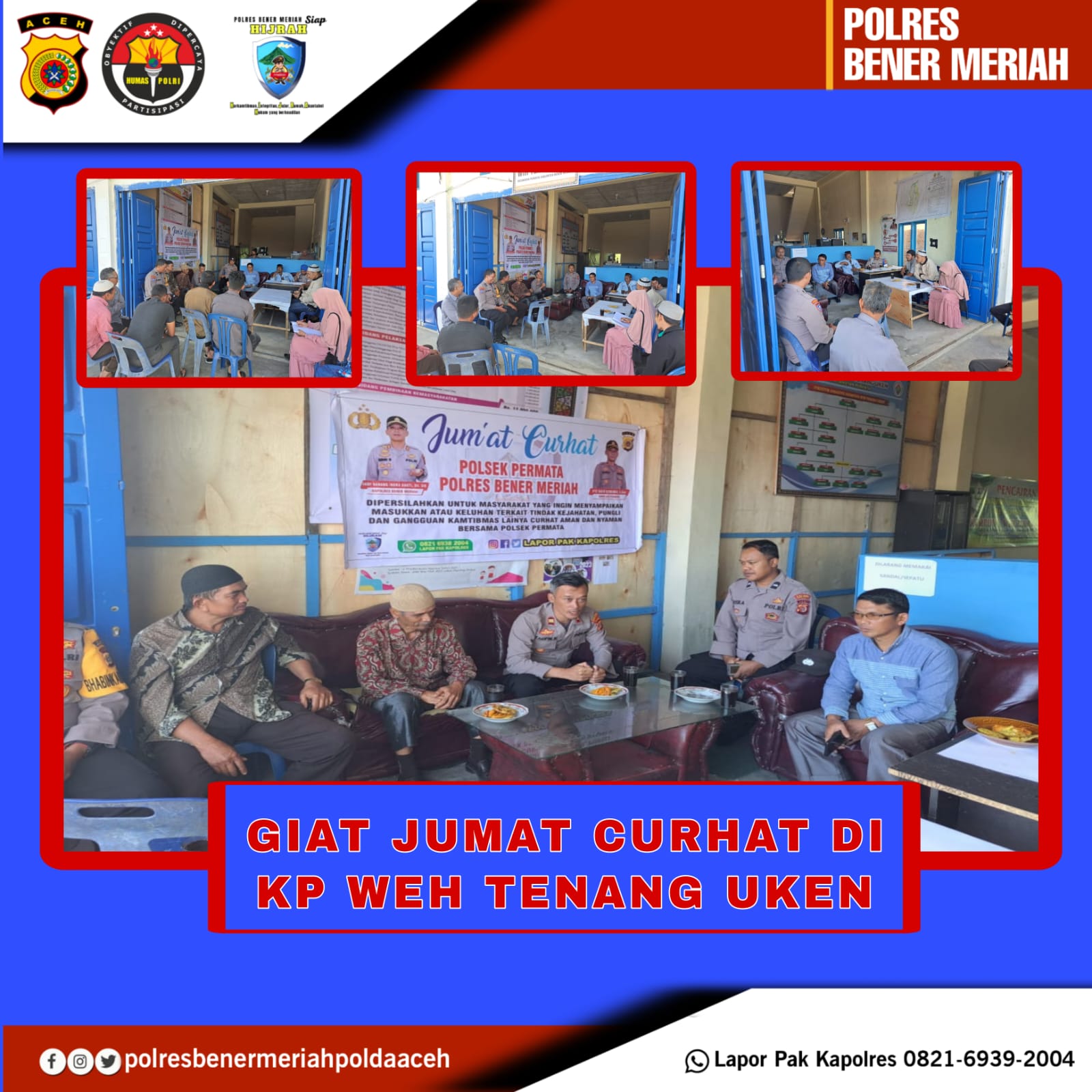 Kapolsek Permata mengatakan Kegiatan Jum’at Curhat ini bertujuan untuk menjalin silaturahmi dengan masyarakat dan mendengar langsung pendapat serta masukan dari masyarakat kepada Institusi Polri, untuk kemajuan Polres Bener Meriah khususnya Polsek Permata.