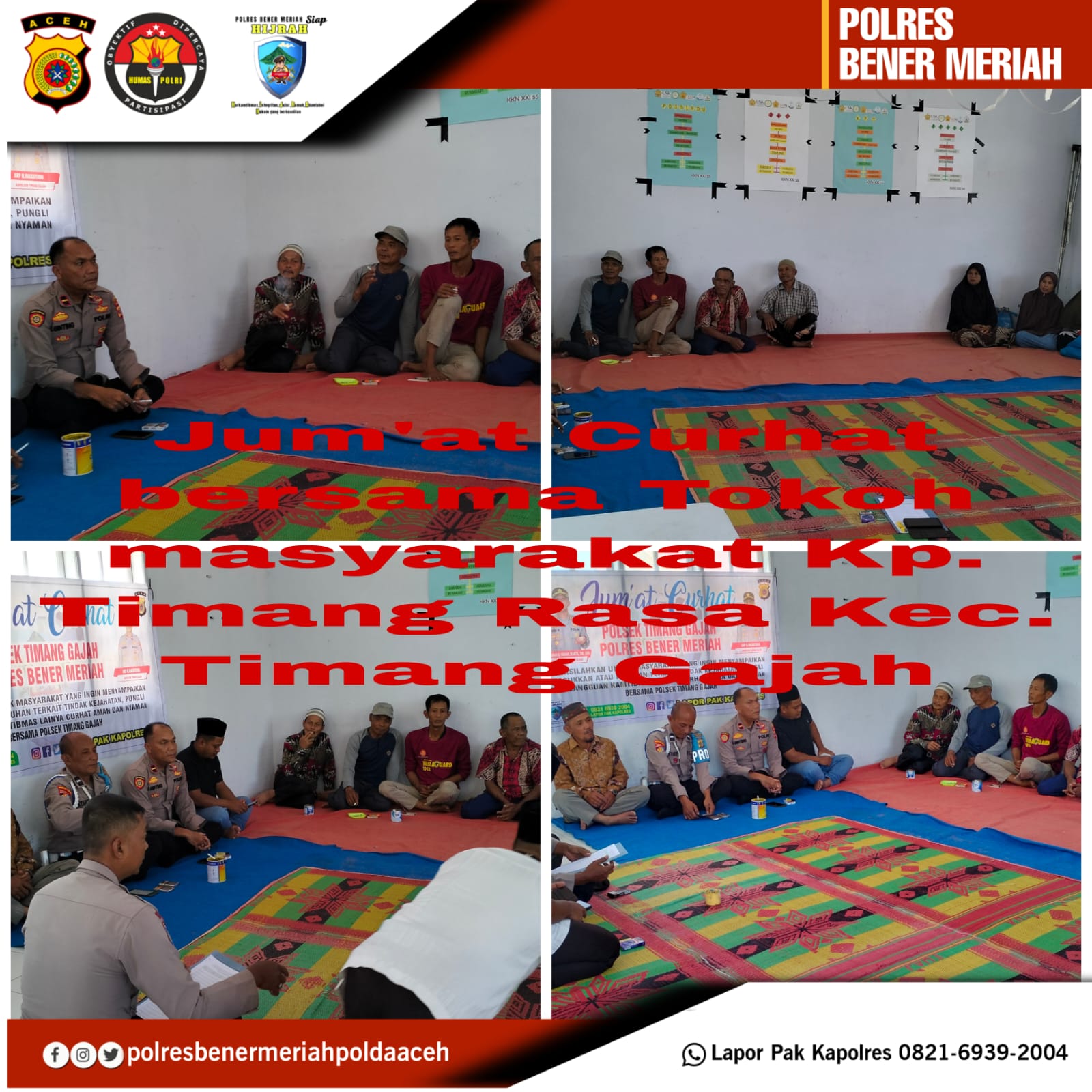 Kapolsek Wih Pesam mengatakan Kegiatan Jum’at Curhat ini bertujuan untuk menjalin silaturahmi dengan masyarakat dan mendengar langsung pendapat serta masukan dari masyarakat kepada Institusi Polri, untuk kemajuan Polres Bener Meriah khususnya Polsek Timang Gajah.