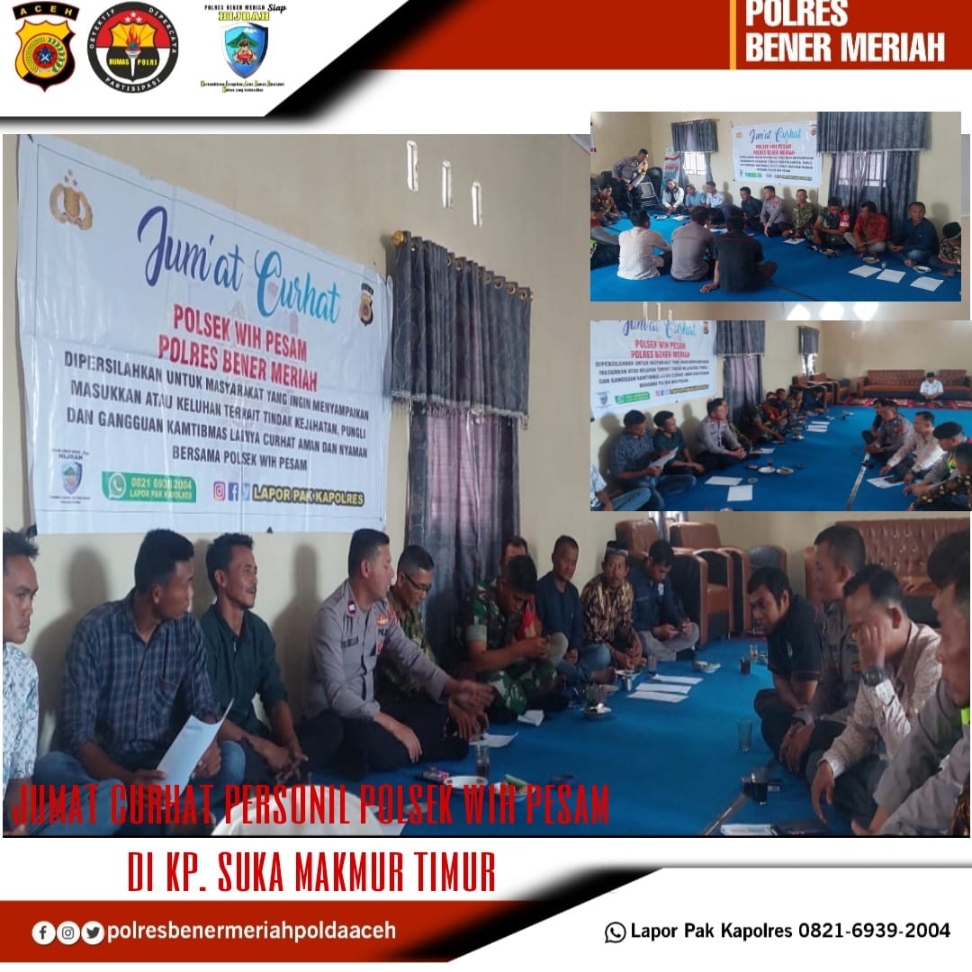 Dalam hal ini curhatan dari masyarakat akan saya sampaikan kepada Kapolres Bener Meriah untuk meminta petunjuk dan arahan yang selanjutnya akan langsung ditindaklanjuti secara preemtif dan preventif, seperti halnya ada keluhan mengenai permasalahan Lalu Lintas, Narkoba dan guantibmas lainnya. Dengan adanya program Jum’at Curhat ini agar kedepannya tugas pokok Kepolisian diharapkan lebih meningkat lagi, khususnya dalam harkamtibmas di Kecamatan Wih Pesam.