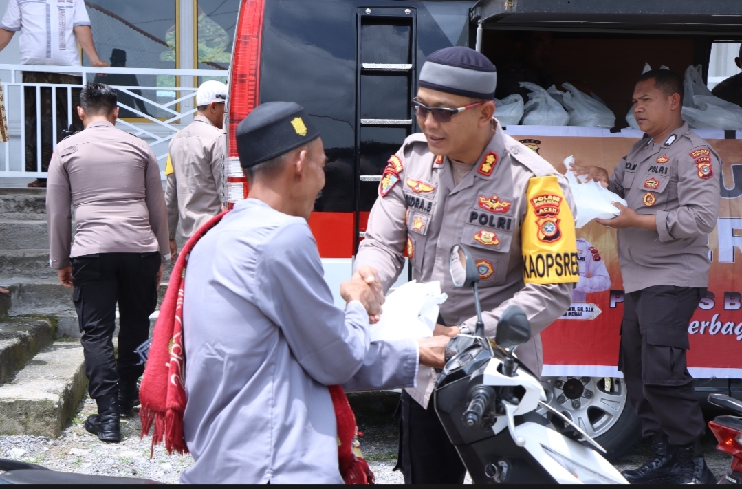 Kapolres Bener Meriah Bagikan Ratusan Bingkisan Makan Siang kepada Jamaah Solat Jumat di Masjid Babbunasihin Kampung Timang Gajah