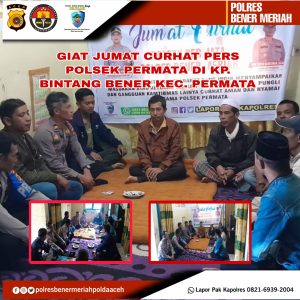 Pada hari Jum’at tanggal 15 September 2023, Kapolsek Permata, IPTU TAUFIK KURNIAWAN,SI.Kom, kembali melaksanakan kegiatan Jum’at Curhat dalam program Quwic Wins Presisi bersama Masyarakat Kampung Bintang Bener, Kecamatan Permata, Kabupaten Bener Meriah.
