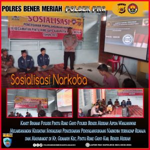 Redelong – Kanit Binmas Polsek Pintu Rime Gayo Aipda Wanjanwar beserta Bhabinkamtibmas Polsek Pintu Rime Gayo Bripka Rahmat Sakti melaksanakan Sosialisasi Penyalahgunaan Narkoba terhadap Remaja / Masyarakat di Kampung Gemasih, Kecamatan Pintu Rime Gayo, Kabupaten Bener Meriah, Rabu (27/9/2023)