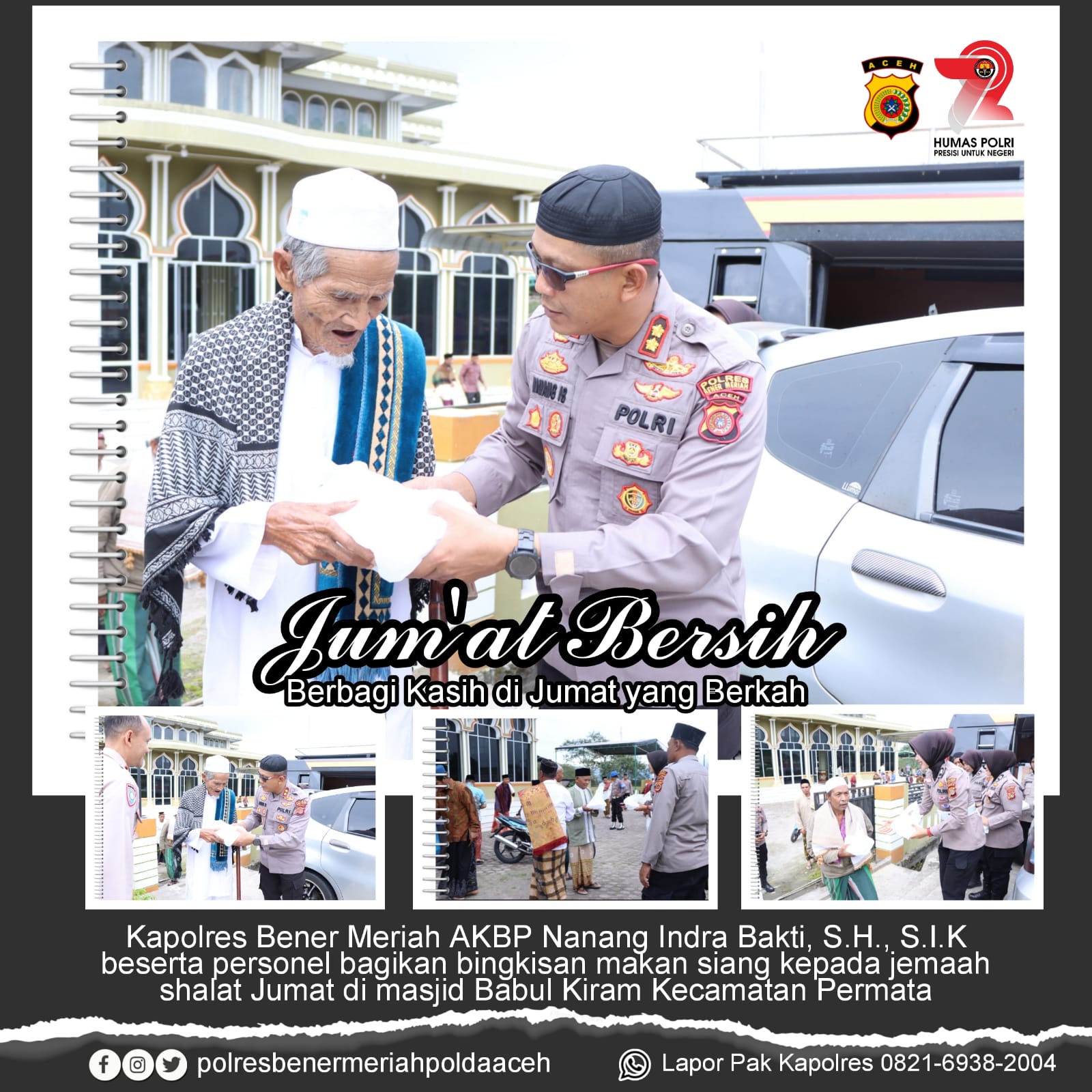Kapolres Bener Meriah Akbp Nanang Indra Bakti, SH, SIK menyampaikan kegiatan ini dilaksanakan rutin setiap Jumat setelah shalat Jumat. tujuan daripada kegiatan ini adalah untuk membantu Masyarakat dan sekaligus mendekatkan Polri dan Masyarakat