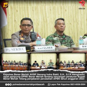 Redelong – Kapolres Bener Meriah AKBP Nanang Indra Bakti SH, SIK Mengikuti rapat paripurna DPRK Bener Meriah tentang rancangan peraturan Bupati Bener Meriah tentang penjabaran perubahan APBK Tahun Anggaran 2023 di ruang sidang DPRK Bener Meriah, Jumat (29/9/2023)