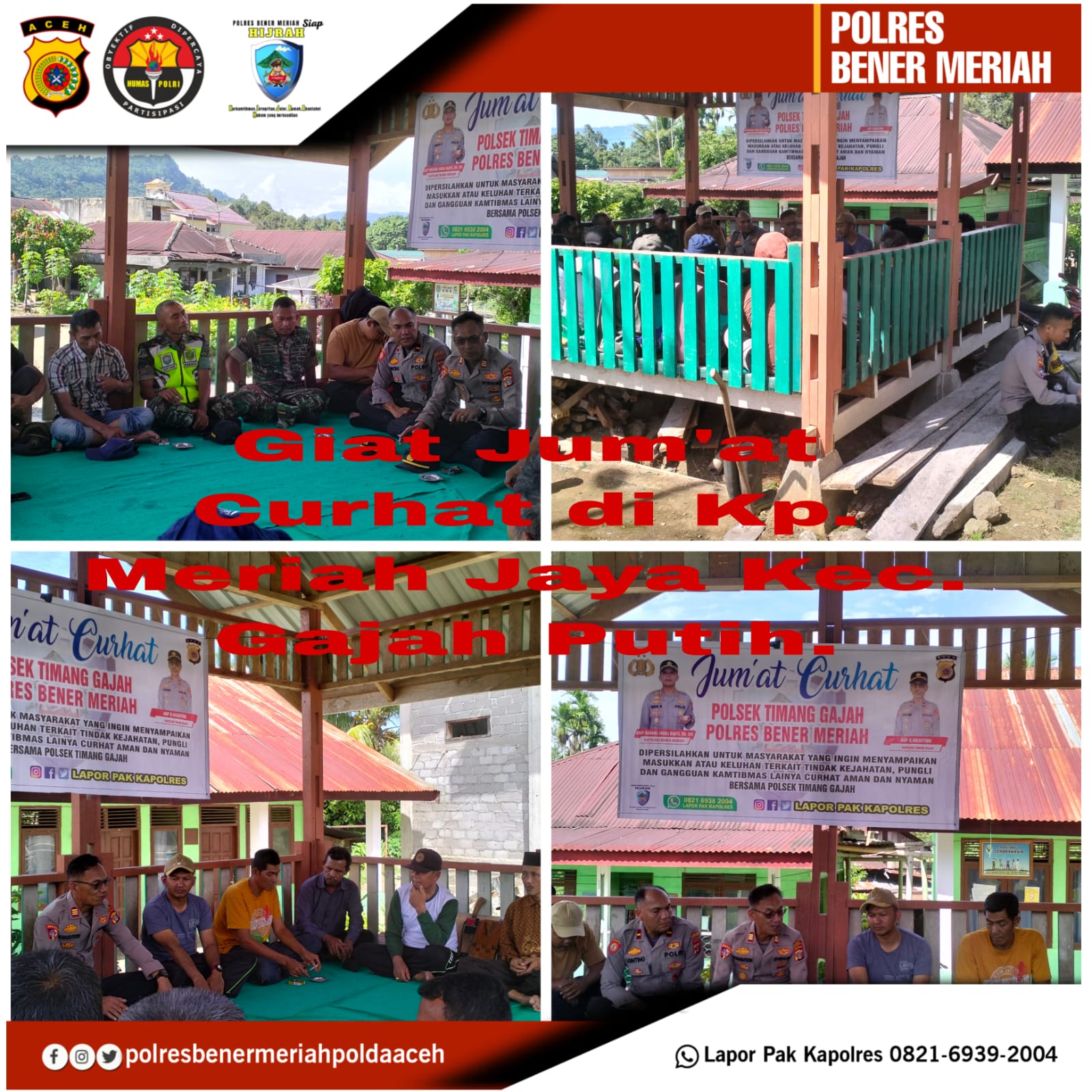 Jum’at Curhat ini merupakan salah satu program gagasan Kapolda Aceh yang dilaksanakan oleh seluruh Polres jajaran Polda Aceh khususnya Polres Bener Meriah. Hal ini bertujuan agar masyarakat dapat menyampaikan secara langsung tentang pendapat, keluhan dan saran kepada Polri.