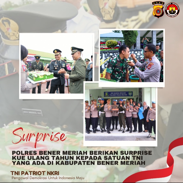 Dalam hati peringatan dan perayaan HUT TNI KE-78 di Bener Meriah, Polres Bener Meriah juga memberikan surprise ke Kodim 0119/ Bener Meriah, Batalyon Rk 114/SM, dan Subdenpom IM/ 1-7 Bener Meriah