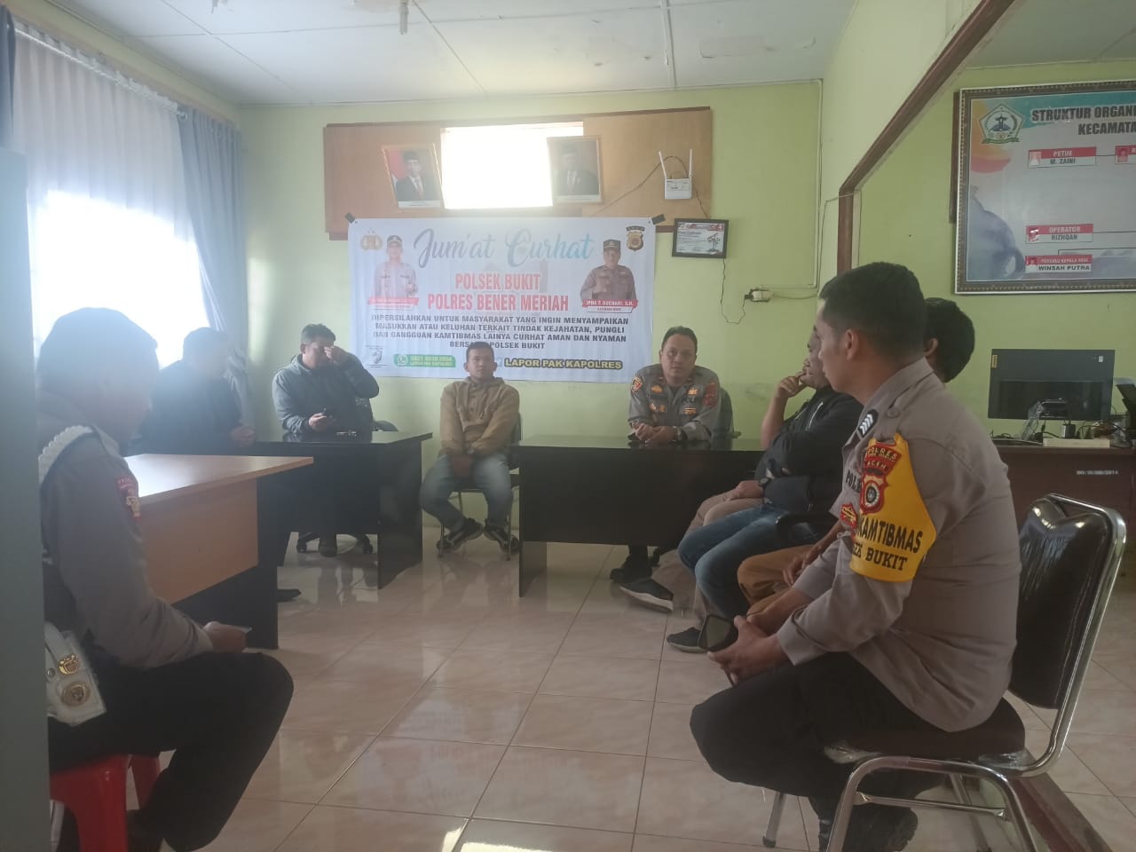 Dalam hal ini curhatan dari masyarakat akan saya sampaikan kepada Kapolres Bener Meriah untuk meminta petunjuk dan arahan yang selanjutnya akan langsung ditindaklanjuti secara preemtif dan preventif, seperti halnya ada keluhan mengenai permasalahan Lalu Lintas, Narkoba dan guantibmas lainnya. Dengan adanya program Jum’at Curhat ini agar kedepannya tugas pokok Kepolisian diharapkan lebih meningkat lagi, khususnya dalam harkamtibmas di Kecamatan Bukit.