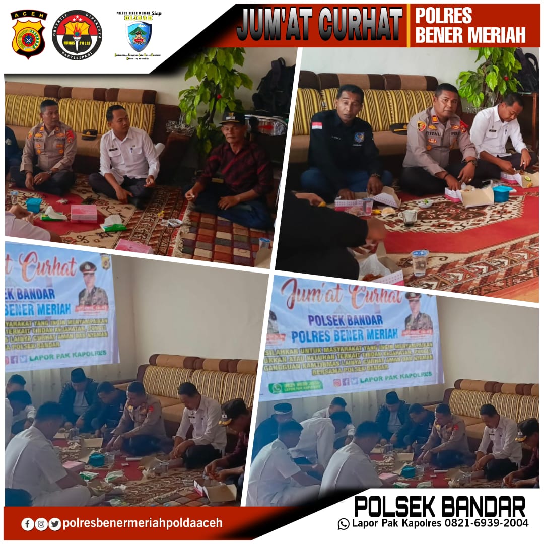 Kapolsek Bandar mengatakan Kegiatan Jum’at Curhat ini bertujuan untuk menjalin silaturahmi dengan masyarakat dan mendengar langsung pendapat serta masukan dari masyarakat kepada Institusi Polri, untuk kemajuan Polres Bener Meriah khususnya Polsek Bandar.