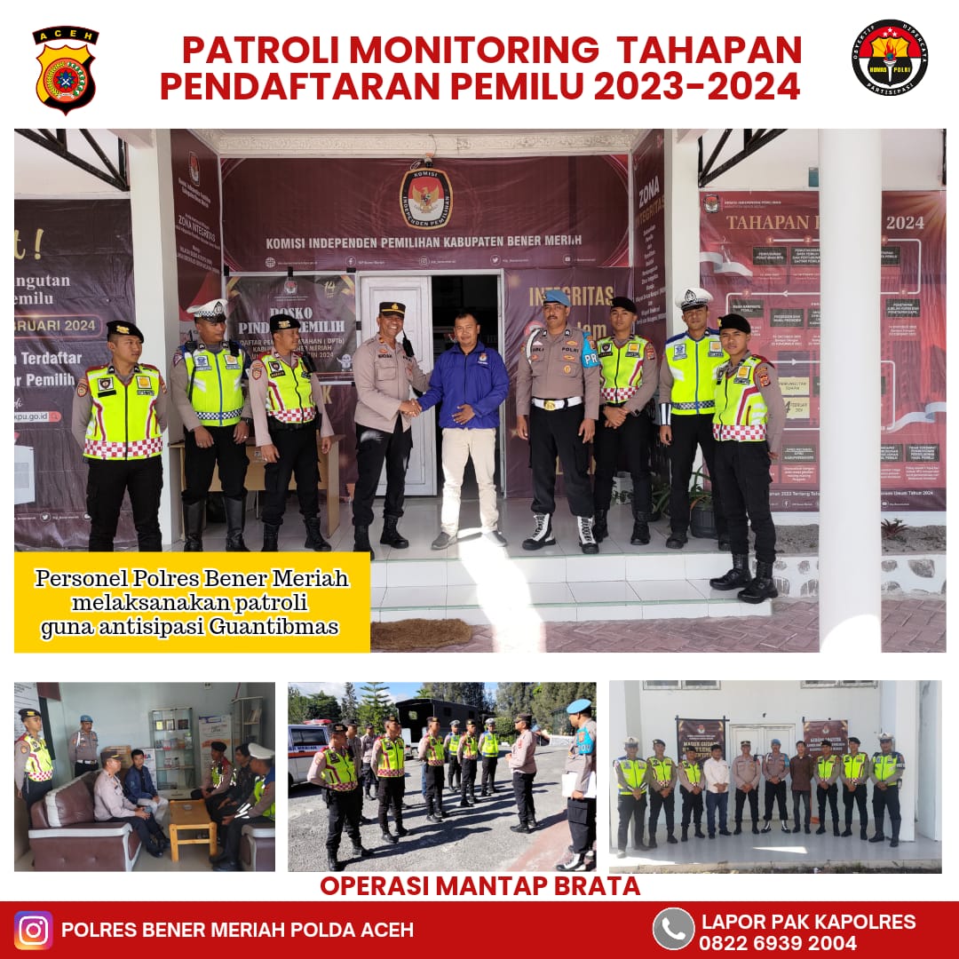 Kapolres Bener Meriah AKBP Nanang Indra Bakti, SH, SIK melalui Kasi Humas Polres Bener Meriah Mengatakan, Kegiatan patroli ini merupakan upaya dari Polres Bener Meriah untuk memastikan kelancaran tahapan pendaftaran pemilu yang sedang berlangsung. Para petugas berpatroli di sejumlah titik penting, seperti kantor-kantor pendaftaran pemilih, tempat pemungutan suara, dan wilayah-wilayah yang dianggap rawan potensi konflik.