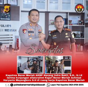 Bener Meriah- Kapolres Bener Meriah AKBP Nanang Indra Bakti, S.H., S.I.K terima kunjungan Kajari Bener Meriah Achmad Haryanto Mayangkoro S.H di ruang kerja Kapolres, pada hari Selasa 14 November 2023.