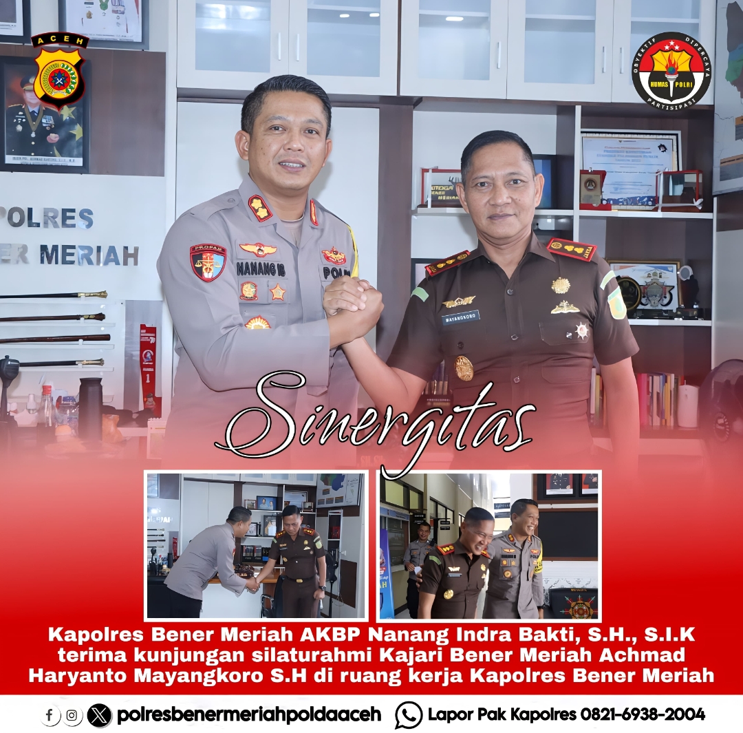 Kapolres Bener Meriah sangat berterima kasih kepada Kajari Bener Meriah yang sudah menyempatkan waktunya untuk berkunjung ke Polres Bener Meriah , kunjungan itu membahas tentang sinergitas yang selama ini telah terjaga antara Polres Bener Meriah dengan Kejaksaan Negeri Bener Meriah, dengan harapan akan terus terjaga.