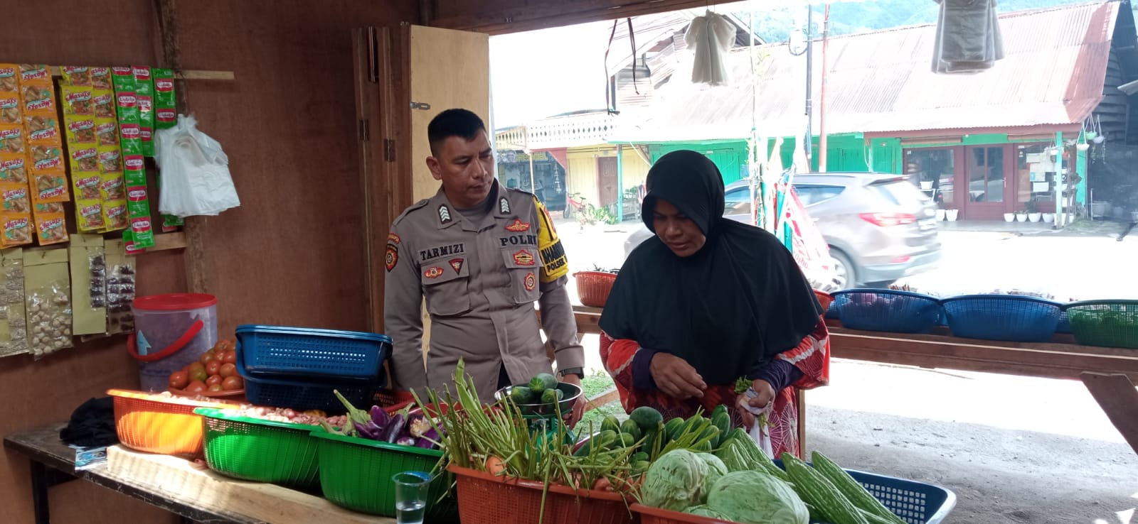 Tampak dalam foto adalah pemandangan menarik di mana seorang petugas polisi bercengkrama dengan ibu-ibu yang sedang berbelanja. Potret kebersamaan ini menciptakan kesan positif karena menunjukkan situasi keamanan yang sangat baik di daerah tersebut.
