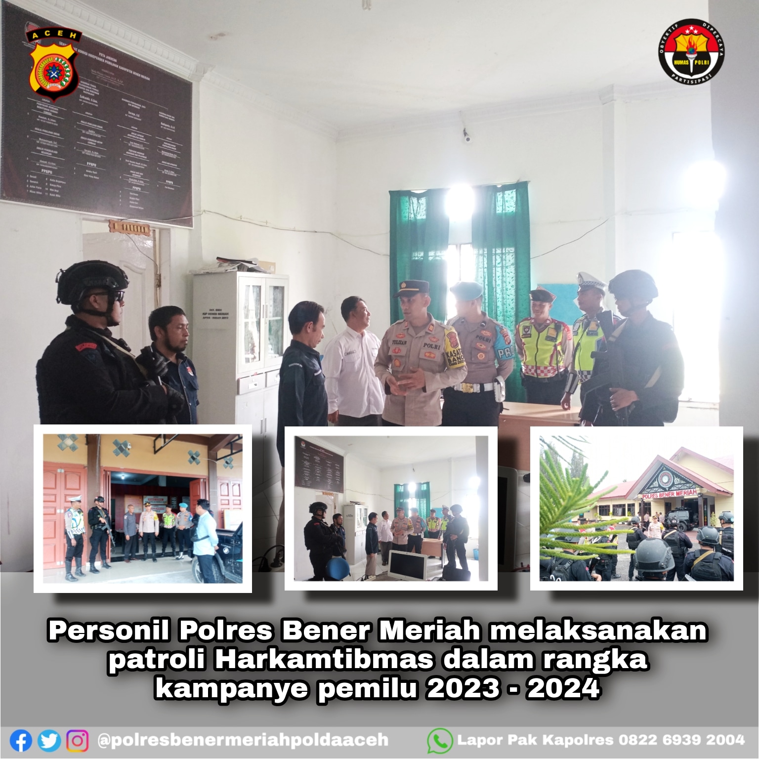 Kapolres Bener Meriah AKBP Nanang Indra Bakti, SH, SIK melalui Kasi Humas Polres Bener Meriah Mengatakan, Kegiatan patroli ini merupakan upaya dari Polres Bener Meriah untuk memastikan kelancaran tahapan kampanye pemilu yang sedang berlangsung. Para petugas berpatroli di sejumlah titik penting, seperti kantor-kantor pendaftaran pemilih, dan wilayah-wilayah yang dianggap rawan potensi konflik.