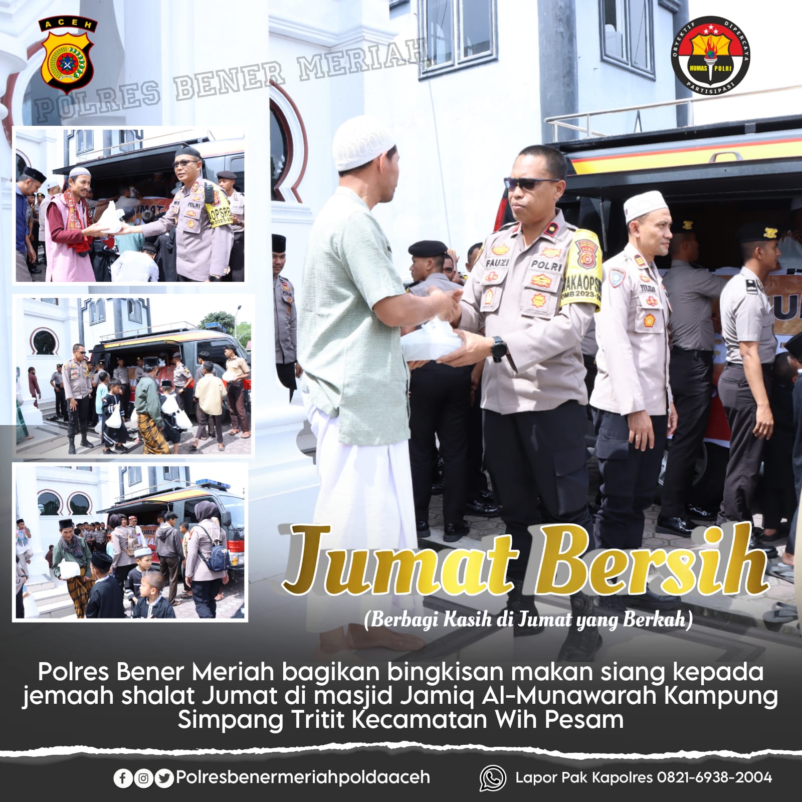Kapolres Bener Meriah Akbp Nanang Indra Bakti, SH, SIK menyampaikan kegiatan ini dilaksanakan rutin setiap Jumat setelah shalat Jumat. tujuan daripada kegiatan ini adalah untuk membantu Masyarakat dan sekaligus mendekatkan Polri dan Masyarakat