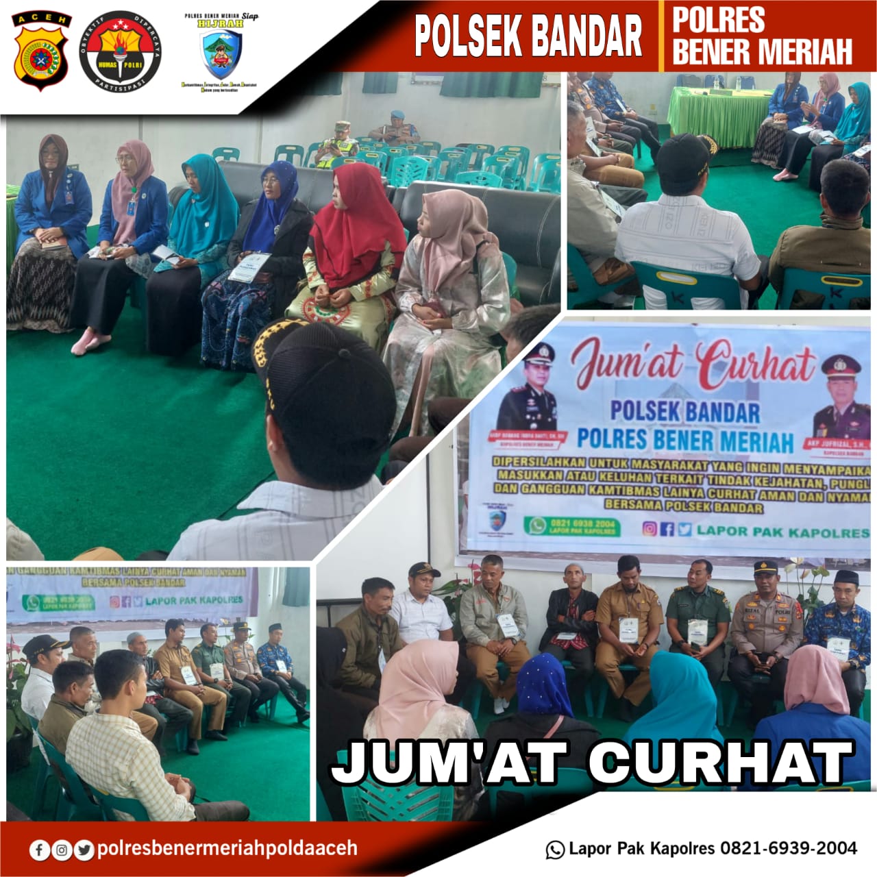 Kapolsek Bandar mengatakan Kegiatan Jum’at Curhat ini bertujuan untuk menjalin silaturahmi dengan masyarakat dan mendengar langsung pendapat serta masukan dari masyarakat kepada Institusi Polri, untuk kemajuan Polres Bener Meriah khususnya Polsek Bandar.