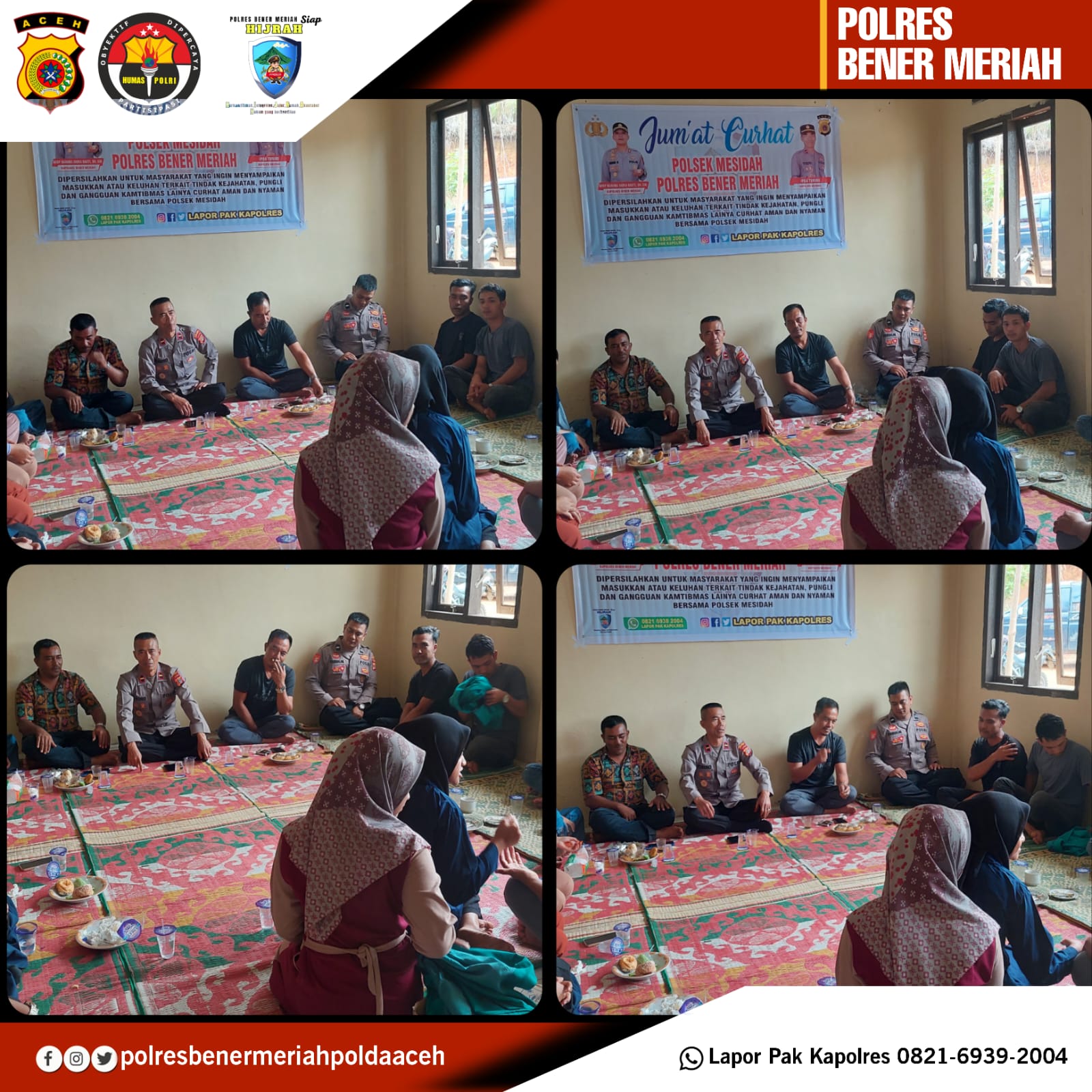 Jum’at Curhat ini merupakan salah satu program gagasan Kapolda Aceh yang dilaksanakan oleh seluruh Polres jajaran Polda Aceh khususnya Polres Bener Meriah. Hal ini bertujuan agar masyarakat dapat menyampaikan secara langsung tentang pendapat, keluhan dan saran kepada Polri.