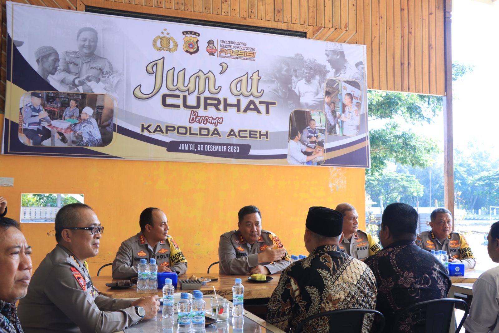 Banda Aceh — Kapolda Aceh Irjen Achmad Kartiko didampingi Wakapolda Brigjen Armia Fahmi dan Kapolresta Banda Aceh Kombes Fahmi Irwan Ramli melaksanakan Jumat Curhat perdana di MZ Kupi Lamprit, Kota Banda Aceh, Jumat, 22 Desember 2023.