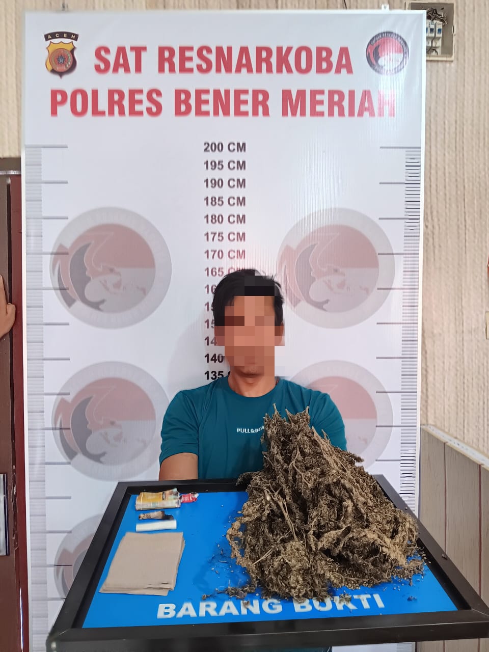 Kapolres Bener Meriah AKBP Nanang Indra Bakti, S.H., S.I.K, mengatakan, benar Satnarkoba Polres Bener mengamankan satu orang pelaku yang diduga menjadi pengedar narkotika jenis ganja. Pelaku di amankan pada saat ada laporan masyarakat bahwasanya rumah pelaku mengalami kebakaran di bagian kamar yaitu satu buah kasur terbakar, saat melakukan pemadaman Personel Polsek Bandar melihat sebuah tas yang mencurigakan stelah dilakukan pemeriksaan ternyata tas tersebut berisikan narkotika jenis ganja.