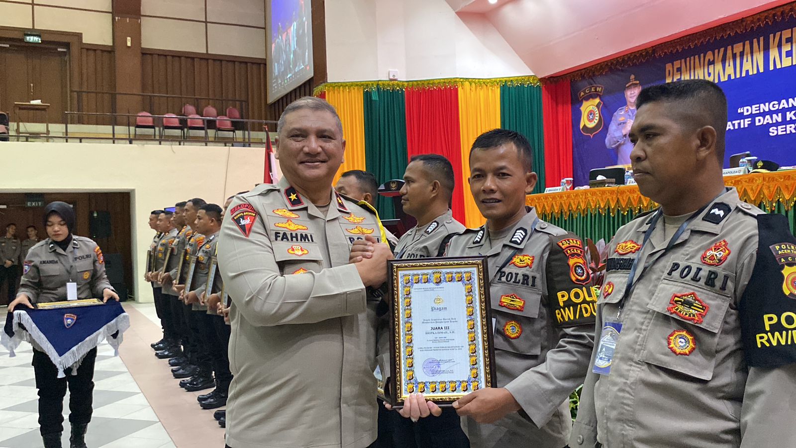 Piagam penghargaan diserahkan oleh Wakapolda Aceh Brigjen Armia Fahmi di Aula Macdum Sakti Mapolda Aceh, Selasa, 23 Januari 2024.