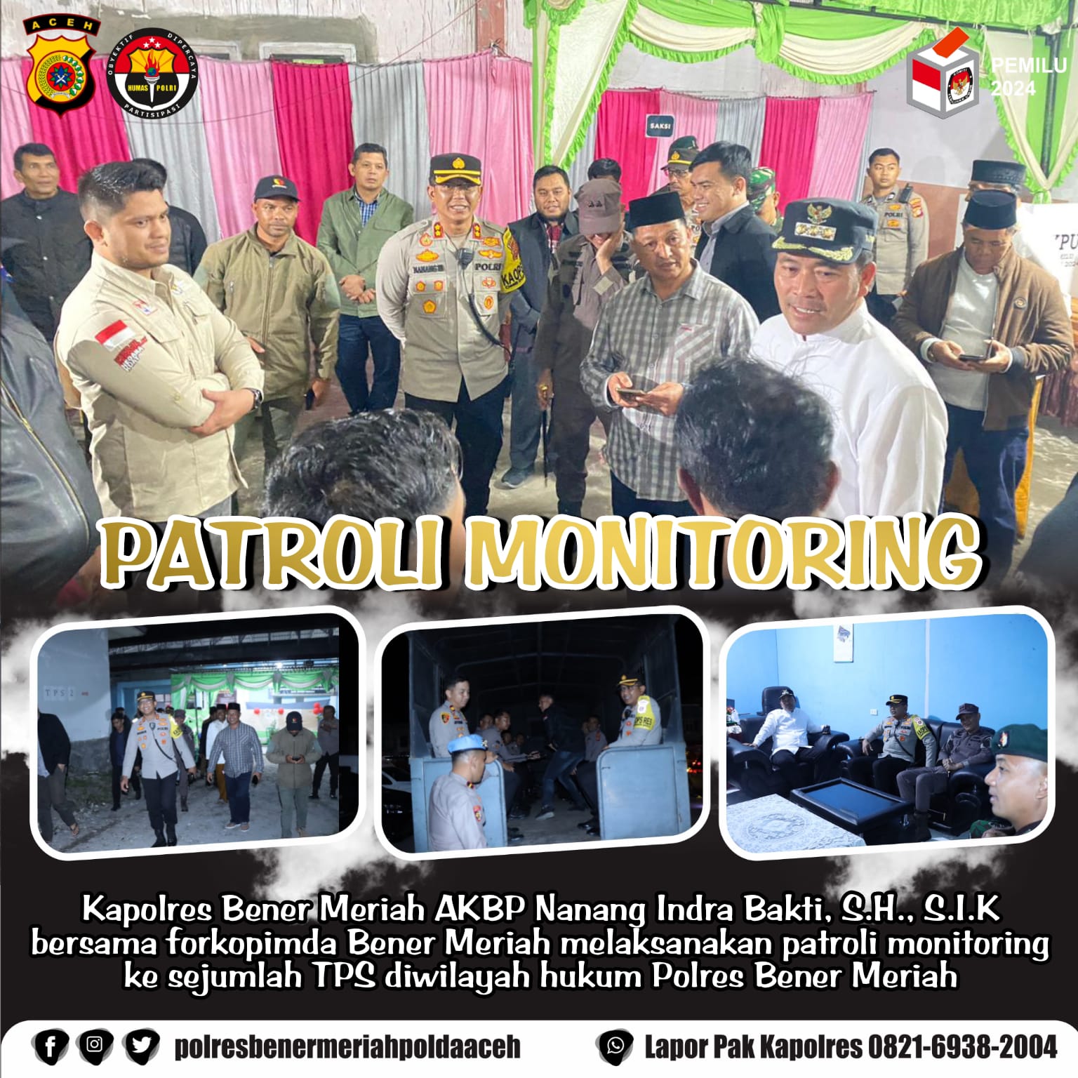 Bener Meriah- Untuk memastikan pelaksanaan pemilihan umum Tahun 2024 di Kabupaten Bener Meriah berjalan aman, Kapolres Bener Meriah AKBP Nanang Indra Bakti, S.H., S.I.K bersama Forkopimda dan Kepala OPD, melakukan monitoring ke sejumlah tempat pemungutan suara (TPS) yang ada di wilayah Kabupaten Bener Meriah, Selasa 13 Februari 2024 malam.