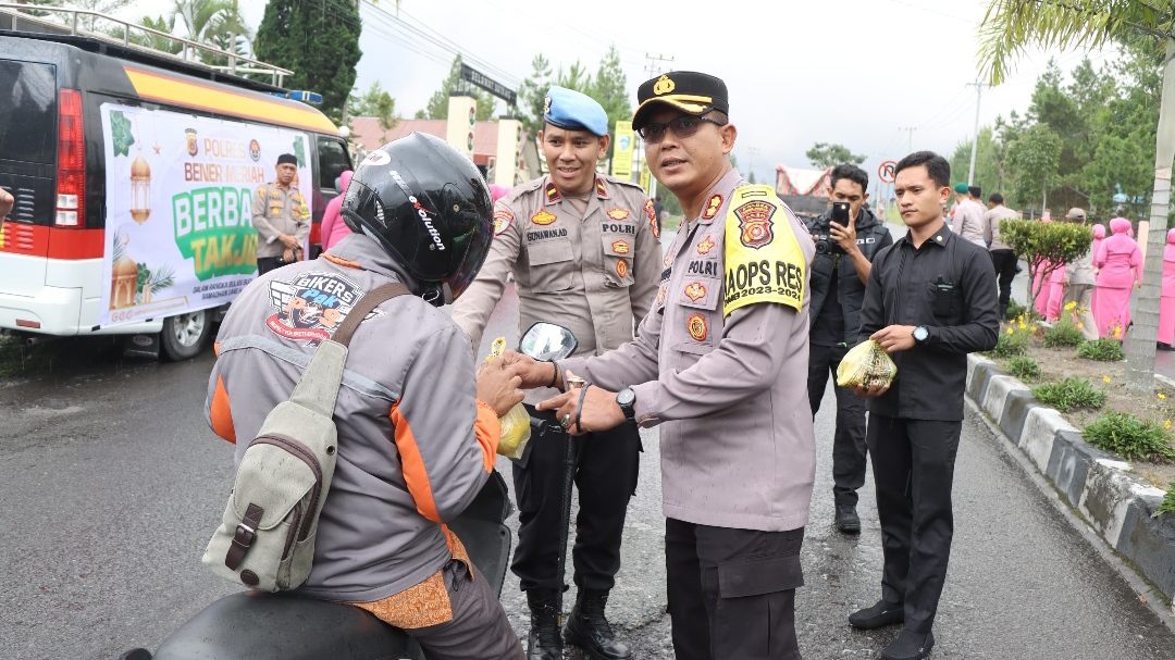 Redelong – Polres Bener Meriah membagikan makanan takjil untuk berbuka puasa kepada pengguna jalan yang melintas di depan Mako Polres Bener Meriah Jumat 22 Maret 2024.