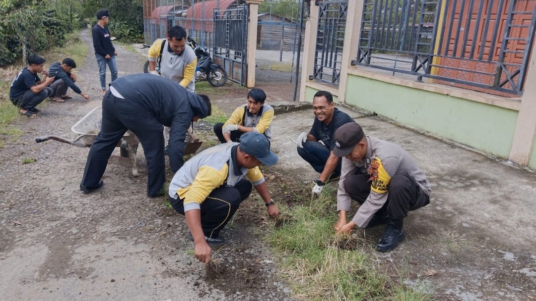 Bhabinkamtibmas juga ikut melaksanakan gotong royong bersama masyarakat di lingkungan sekitar, sembari memberikan himbauan Kamtibmas.