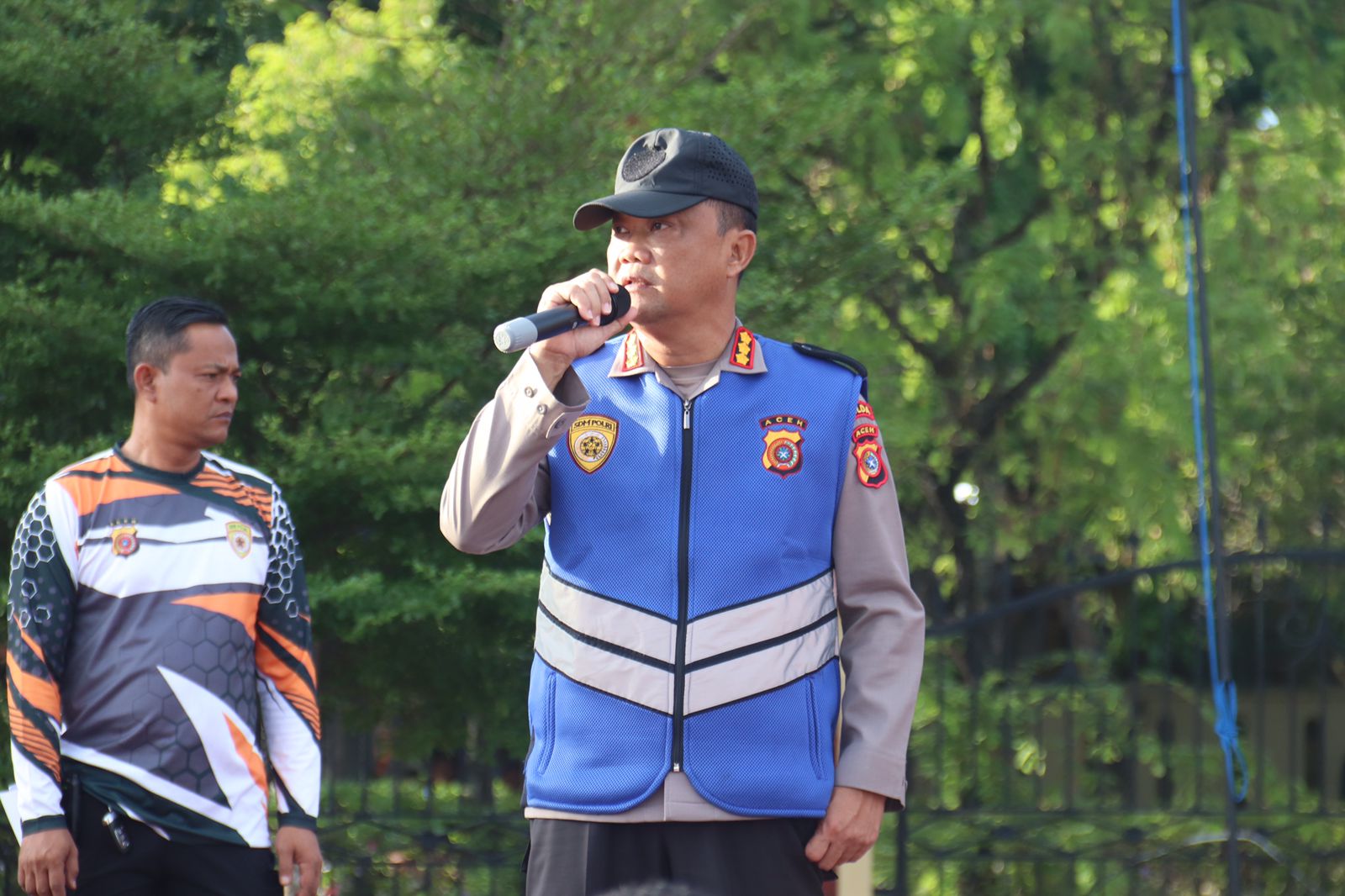 Kabid Humas Polda Aceh Kombes Pol. Joko Krisdiyanto, S. I. K, selaku Ketua Tim dalam tes jasmani calon Bintara Polri memimpin kegiatan tes jasmani, Minggu (9/6/2024).