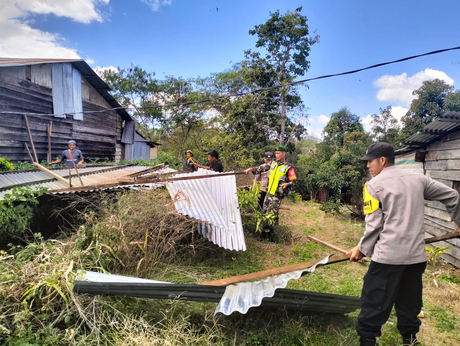 Personel Polsek Permata Bersama Dengan TNI Bantu Bersihkan Puing Puing Rumah Warga Yang Rusak akibat Bencana Alam Angin Puting Beliung