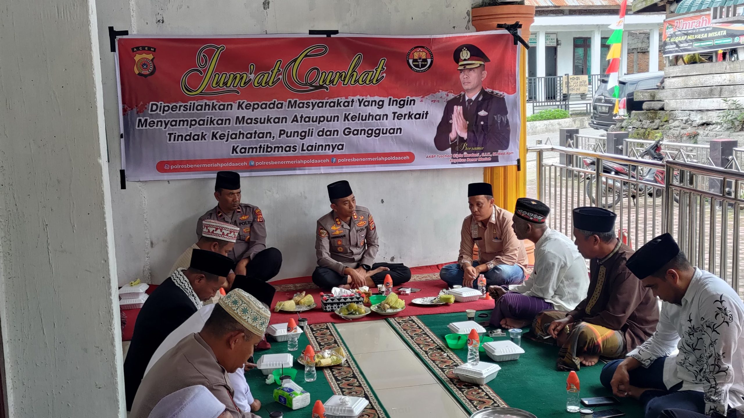 Acara ini melibatkan Camat, Reje Kampung, tokoh agama, dan tokoh masyarakat setempat. Kapolres Bener Meriah menyatakan bahwa Jum’at Curhat bertujuan untuk menjalin silaturahmi dengan masyarakat serta mendengarkan langsung masukan dan pendapat dari warga terkait institusi Polri untuk kemajuan Polres Bener Meriah.