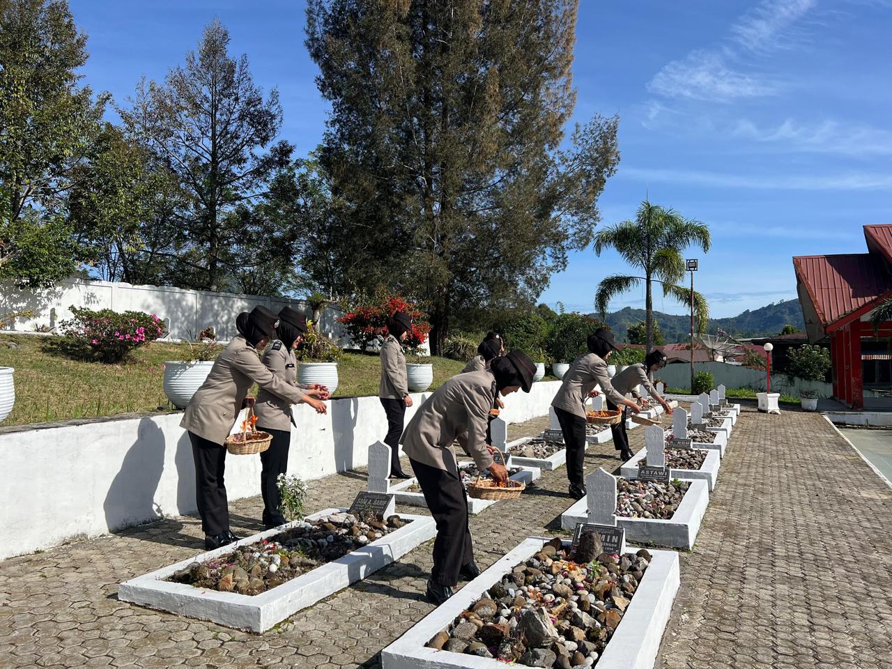 Dalam suasana yang khidmat dan penuh haru, para Polwan melakukan tabur bunga dan memanjatkan doa sebagai bentuk penghormatan kepada para pahlawan yang telah berjuang demi kemerdekaan Indonesia.