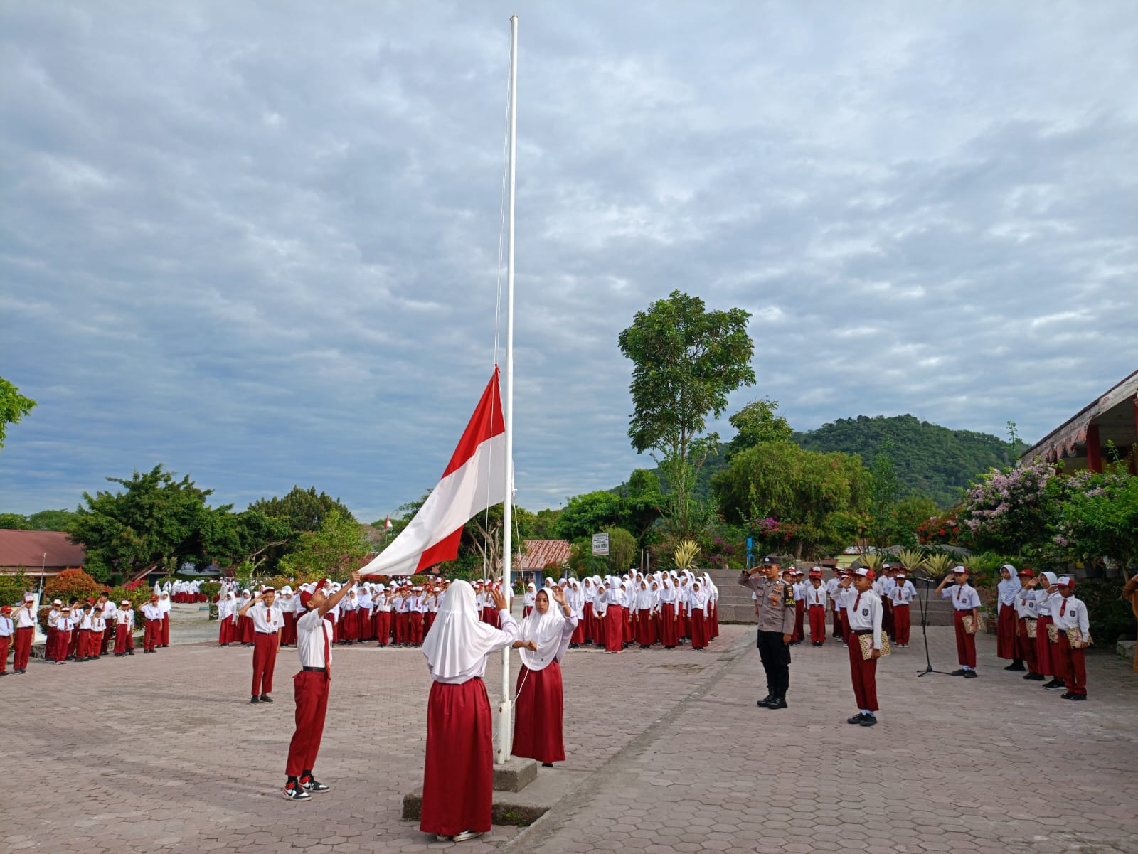 Redelong – Personel Polsek Wih Pesam melaksanakan kegiatan Saweu Sikulah / Polisi Negehi Sekulah dan hadir sebagai Inspektur upacara bendera di SD Negeri 1 Pante Raya, Kampung Pante Raya, Kecamatan Wih Pesam, Kabupaten Bener Meriah, Senin 23 September 2024.