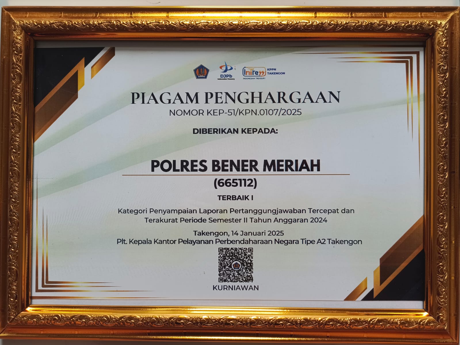 Diberikan kepada Satker Polres Bener Meriah untuk Kategori Laporan Pertanggungjawaban Tercepat dan Terakurat Periode Semester II Tahun Anggaran 2024.