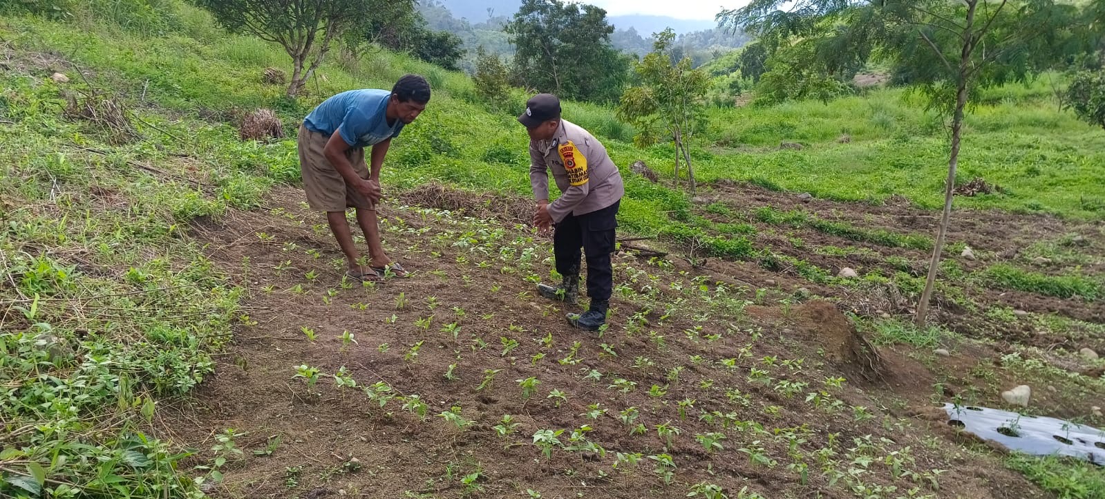 Dalam keadaan sedang berpuasa, Bhabinkamtibmas tetap semangat bertugas menjaga keamanan, ketertiban dan juga membantu warga mewujudkan lahan produktif.