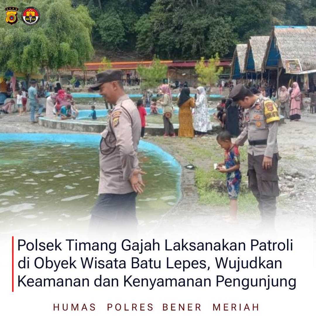 Bener Meriah, 31 Mei 2025 – Dalam upaya menciptakan situasi kamtibmas yang kondusif di kawasan wisata selama akhir pekan, jajaran Polsek Timang Gajah melaksanakan patroli rutin di Obyek Wisata Batu Lepes yang terletak di Kampung Lampahan, Kecamatan Timang Gajah, Kabupaten Bener Meriah, pada Sabtu (31/5/2025) pukul.