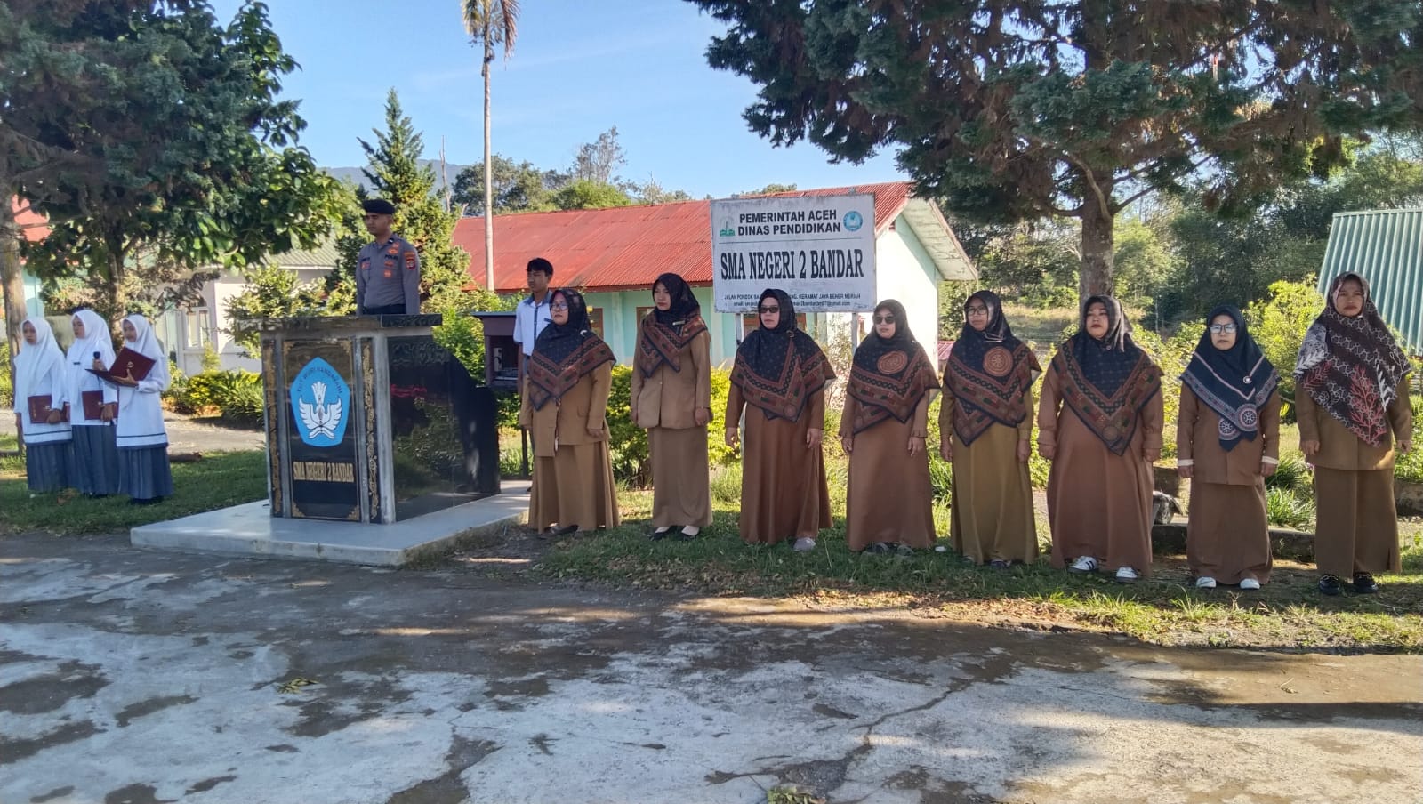 Kegiatan yang merupakan bagian dari program Saweu Sikula ini berlangsung sekitar pukul 07.30 WIB dan turut dihadiri oleh Kepala Sekolah SMA N 2 Bandar, Bripka Muktamar selaku Bhabinkamtibmas setempat, serta seluruh dewan guru dan siswa-siswi sekolah tersebut.