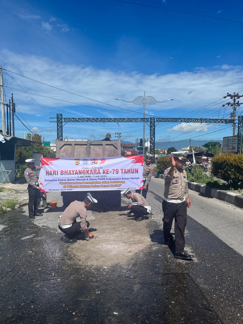 Bener Meriah – Dalam upaya meningkatkan keselamatan dan kenyamanan pengguna jalan, Satuan Lalu Lintas (Satlantas) Polres Bener Meriah melaksanakan kegiatan penambalan jalan berlubang dalam rangka hari Bhayangkara ke-79 di ruas jalan Pante Raya menuju Bandara Rembele, Kabupaten Bener Meriah, pada Rabu (11/6/2025).
