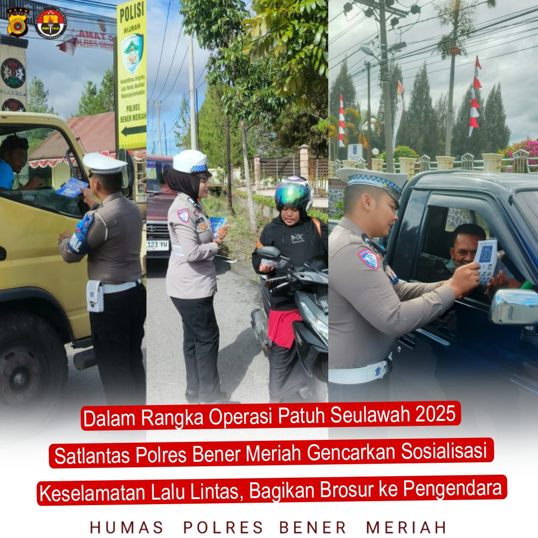 Kapolres Bener Meriah AKBP Aris Cai Dwi Susanto mengatakan, Dalam kegiatan tersebut, personel Satlantas membagikan brosur edukatif yang berisi pesan-pesan keselamatan berkendara, etika berlalu lintas, serta tips berkendara aman kepada para pengendara yang melintas. Selain itu, petugas juga melakukan himbauan langsung untuk meningkatkan kesadaran masyarakat terhadap pentingnya tertib berlalu lintas.